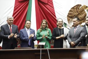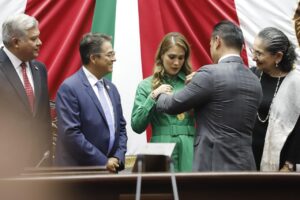 Ante autoridades estatales, presidentes municipales y notarios michoacanos, a nombre del Congreso del Estado y en representación del Gobernador del Estado, Carlos Torres Piña, impuso la condecoración a la presidenta del Consejo Directivo del Colegio de Notarios de Michoacán, Lic. Isania Lisbeth Solórzano Juárez.